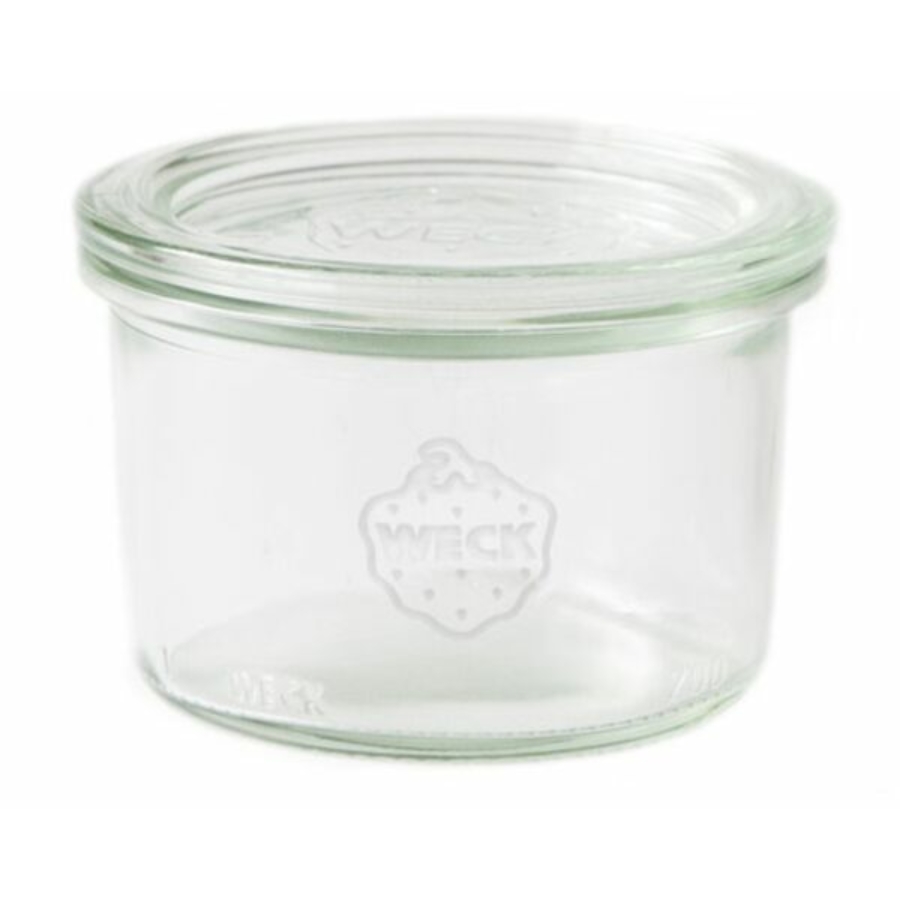 Weck® dzsemes üveg, üveg fedővel, a fedő hermetikusan záródóvá tehető a gumi tömítéssel és a fém klippel, méretei átmérője 8 cm, magassága 5,6 cm. 12 db / doboz csomagolásban.