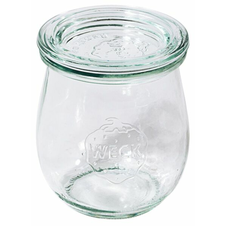 Weck® dzsemes üveg, üveg fedővel, a fedő hermetikusan záródóvá tehető a gumi tömítéssel és a fém klippel, méretei átmérője 6 cm, magassága 8 cm. 12 db / doboz csomagolásban.